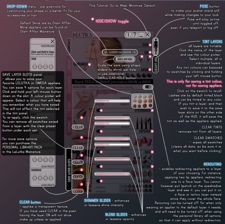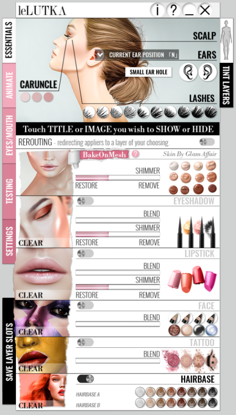 Another day, another sneak peek for the upcoming Skin Fair. Today is the newest LeLutka head, Korina. I’m wearing Korina right out of the box with the default shape, brow shape, eyes and skin. No adjustments on the shape at all. The only thing I did to the skin was add light freckles, a little eyeliner and a touch of lipstick from the new HUD. I was pleasantly surprised when I popped the hud on and up came a tutorial on all the inner workings. The totorial changes as you click on it to show the next tab and I have to tell you….it’s really detailed. I took the picture before I messed with any of this…ya know…just in case my ear wound up in my eyeball or something. Luckily there’s already a backup head in the box! ❤