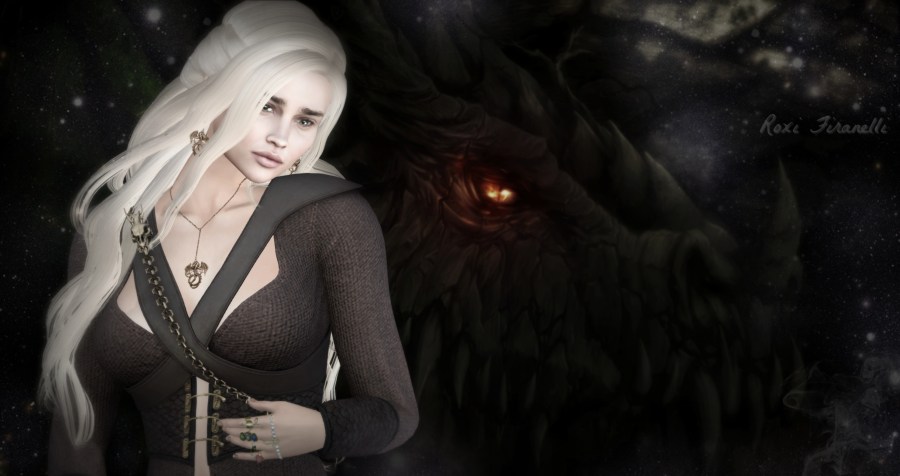 Have you been to The Iron Throne yet? Session skins nailed Khaleesi’s face in their skin applier for the Genus head and it goes well with DeLa’s new Daenerys ‘do … both can be found at Enchantment right now ❤