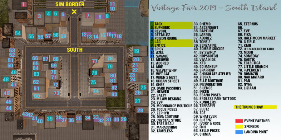 At noon SLT Vintage Fair 2019 opened to the public! Hopefully, you have your shopping list at the ready and know which sim to hit for each store. As a reminder, here’s the shopping guide and below you will find a map of each sim with the stores on them. Also…remember for this first weekend there is a complexity limit of 50,000….which sounds like a lot…but not so much as it turns out. I went to one of the sims to take this picture and the bouncer yelled at me because I was at 58,000…then he sent me home. I had no shoes on and wiped the scripts from my hair, earrings, and glasses (there were none in the dress). I went back and wasn’t there 30 seconds when the bouncer started yelling at me again saying I was at 51,000. I mentally gave him the finger and took the picture quick right before he unceremoniously booted me again. Just to show him he’s not the boss of me, I went back and took the close up….then left before he could do diddly squat. So yeah…go invisible this weekend ❤