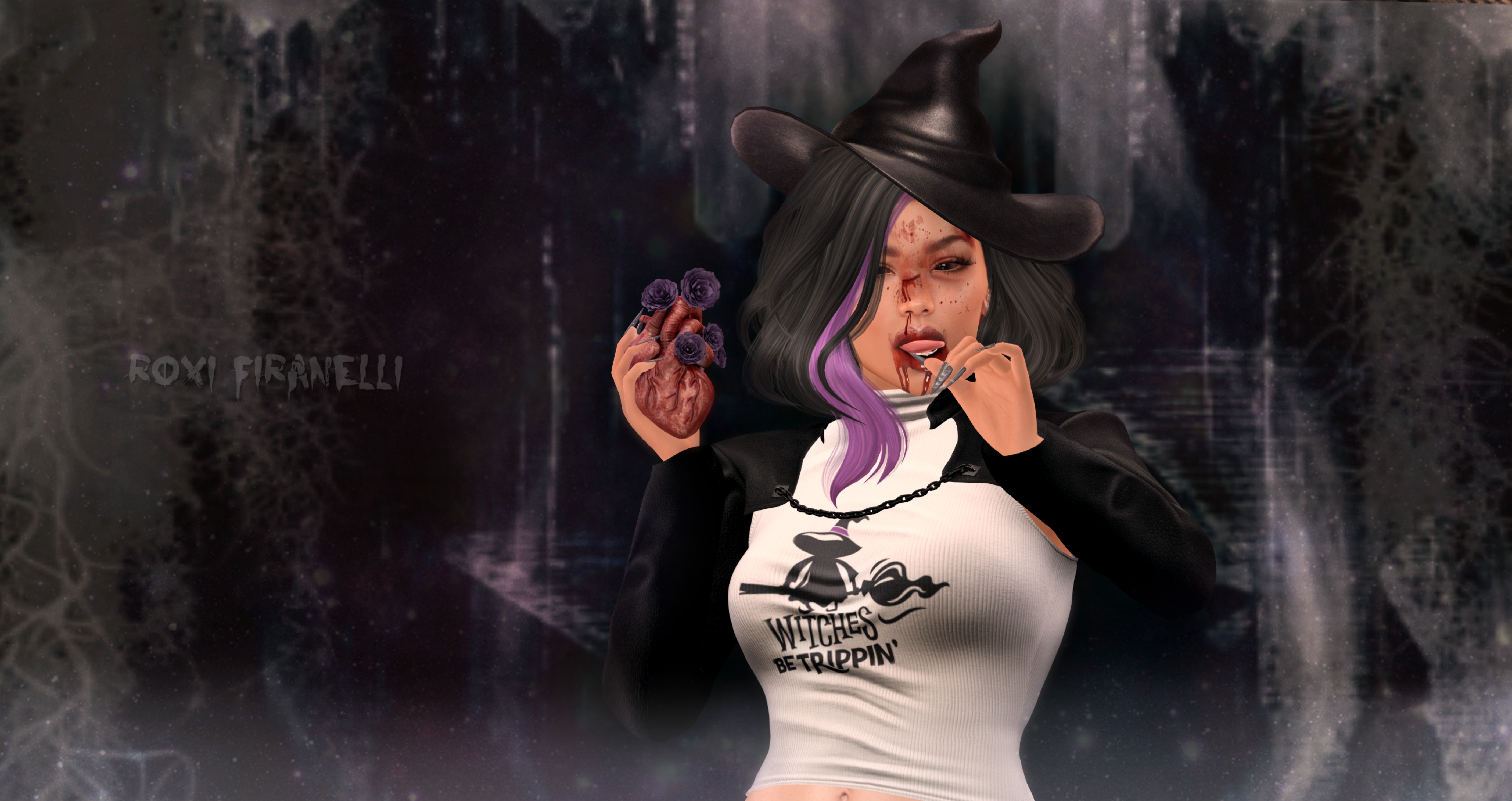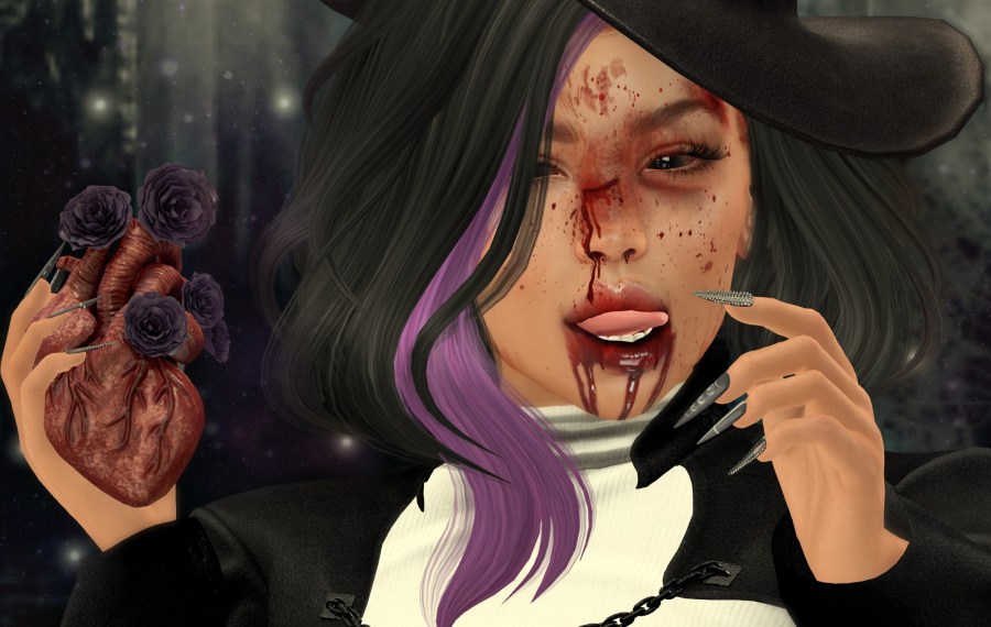 The creaky gates have finally swung open and the masses have descended to indulge in the yearly rite which is Salem. They will not be disappointed…from cute spooky to holy shit disturbing (there’s a pose set that I just would not be comfortable with…butchery wise) there is something for everyone this Halloween season. The outfits run the gamut too, hoho to casual freakish to uber classy gowns Morticia would wear. For example…I looooove this no sleeve turtleneck and bolero from Tori Torricelli. They’re sold separately and come in a plethora of colors and designs. You can look classy with a more serious solid shade or design for the turtleneck…I chose to go with fun, cause anyone walking around with a huge purple stripe in their hair can’t be all serious…and the little witch on the shirt has a purple stripe on her hat. Coincidence? I think not. The hat comes with the hair (but you can wear the hair alone if you like after the season) from Limerance but beware…the 2nd color strand is only available with the fatpack. The heart just made me happy…gruesome and fun at the same time with the flowers sprouting out. The nails are all different, you can see them better in the closeup below. I don’t normally wear separate nails, but I like how these look all stabby 💀