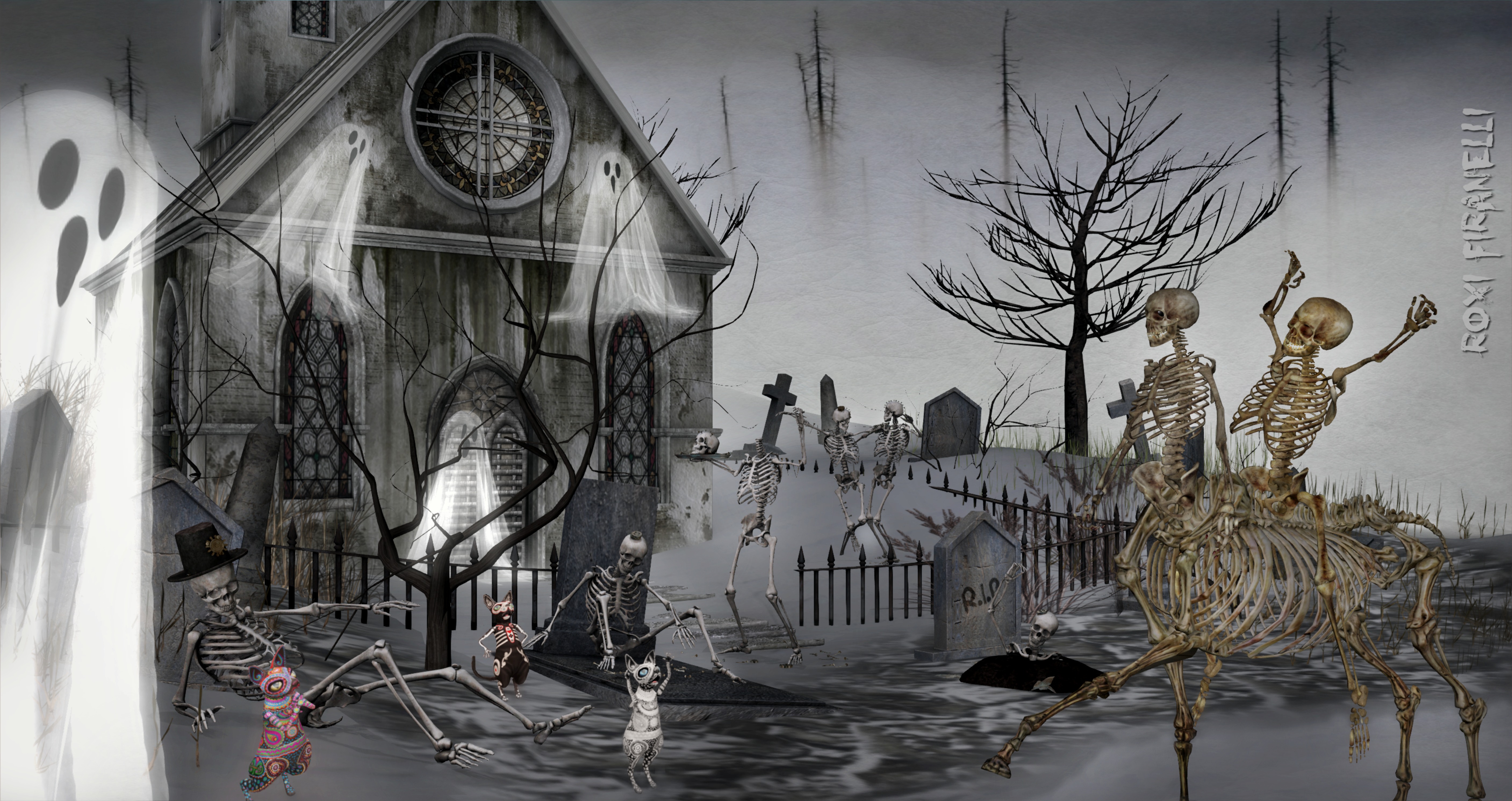 The critters are the newly designed Culprit Sphynxie’s for the Halloween season. Fiesta, Ghost, and Skelly are all too happy to tag along and amuse the hell out of you and everyone around you. The HUD has some hilarious animations….one day I’ll find a good reason for the “roach” one and the “Egyptian” one! I used a different animation for each…and since you can’t wear 3 at the same time or run the hud if they’re not attached, this means I wore them one at a time, placed them, ran an animation, took the shot, and changed to the next. All while wearing a Jinx skeleton centaur avie who never freaking stops moving, turns every time you click somewhere to move something and just wants to freaking sit when you try to hold still on a pose stand (but man, it’s magnificent when it’s doing its centaur thing). Thankfully the MudHoney ghosties and DaD Party Skullys are static and the Jinx skelly rider stays seated…although there IS a HUD that lets you do some dancing or funny gestures while on your mount. It was pretty chaotic bringing it all together…along with a lot of laughing and then a lot of pictures that had to get married together. So worth it though. 💀