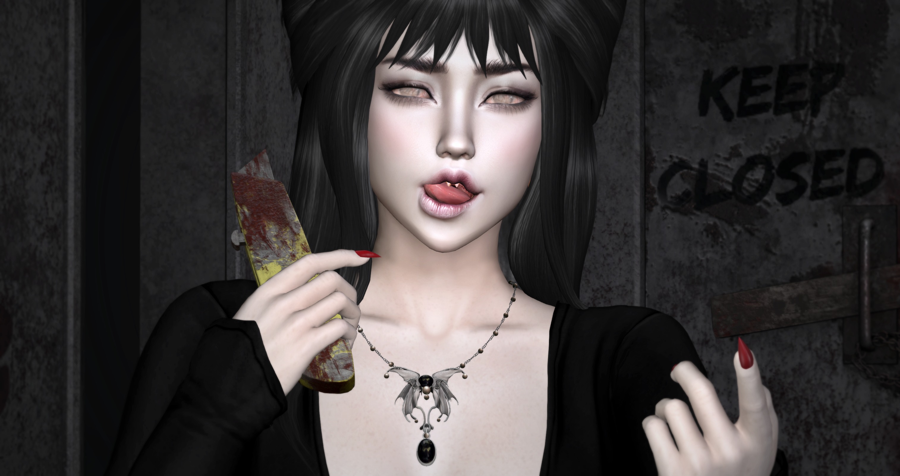 Also adding to the gothness is Heartsdale’s necklace, Aurora, out at Swank and the box cutter from Solus @ The Liaison Collaborative 💀