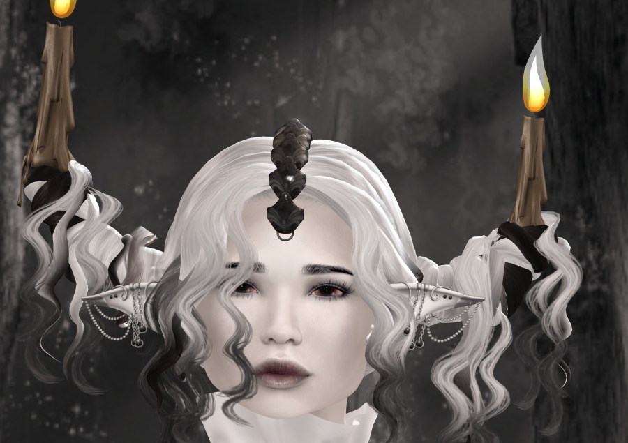 The closeup shows the delicate details of ND/MD’s Goth skin and eye appliers out at Sense… there is a slightly darker tone…really it’s more…less pale…still gothy though. Loooove the lips! The cool hair is Analog Dog (Hallow Manor) and the scales coming down the middle part on the head is Stay Chic (We Love Role-Play) 💀