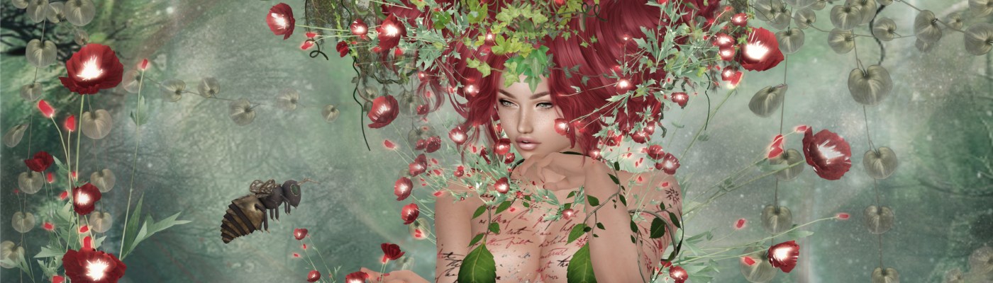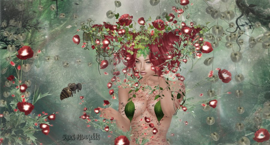 So, I need to explain the outfit. I was looking for something to go with the poppies…not as easy as you’d think. The poppies are from E.V.E and are at Enchantment’s “Princess Bride” right now. They attach to you at different points and there’s a hud to change colors or make them animated. They’d look odd with regular clothing (tried) so of course, I looked into my Boudoir folder for inspiration and came across an older outfit, Poison Ivy. How old you say? The mesh pieces are in sizes …. xsm, sm, m, lg….you get the idea (so what, they still work). The hair though…..the hair with the vines wrapped in it is beyond awesome and really sets the outfit off! The tattoo I just got this morning. It’s called “Love Letters” and is made by Nile Karas of Flower Dreams. It comes in red and black…. I’m wearing the red and loooove how it has a slightly holographic look to it. It goes all the way down one leg to the ankle and all the way around the back…..and it’s just cool looking. ❤