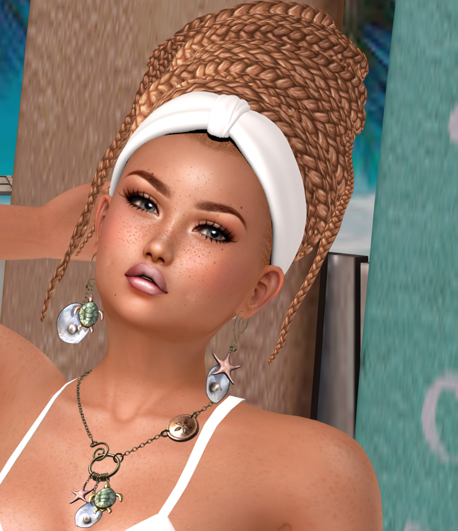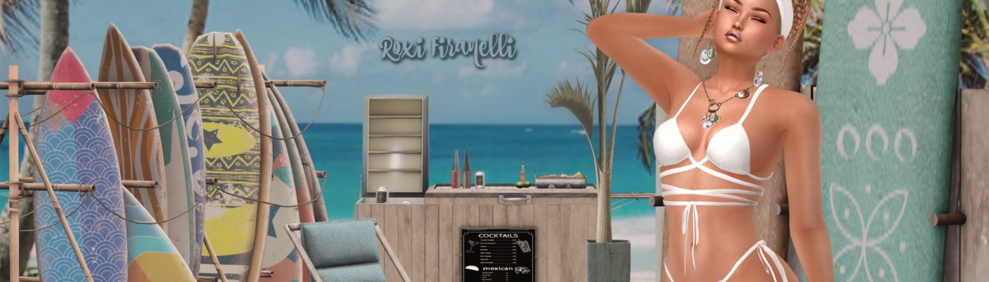 Favorite thing at The Liaison Collaborative so far? Vanity’s new braided updo with the headband. I’m wearing a lightish brown from that color pack and I love that it has red and blond tones in it! Matching hair bases are included and there is (of course) a HUD for the headband with white and textures. The beachy jewelry is from rise Design and also has a handy HUD. Crates bar set is perfect on any beach and Pitaya’s surfboards go with it like they were made for each other. Time to get yer beach on peeps….even if it’s only on SL! ❤