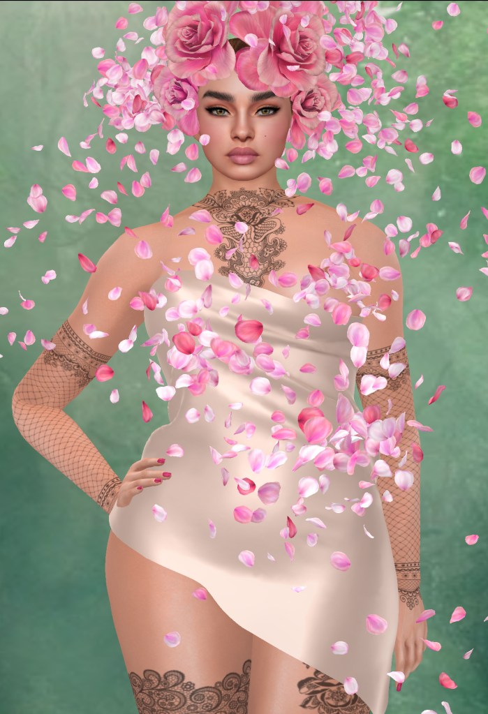 Boudoir – Touch outfit, including dress (Maitreya, Hourglass, Physique), petals for breast, chest and stomach, petal hat, smaller floating petals