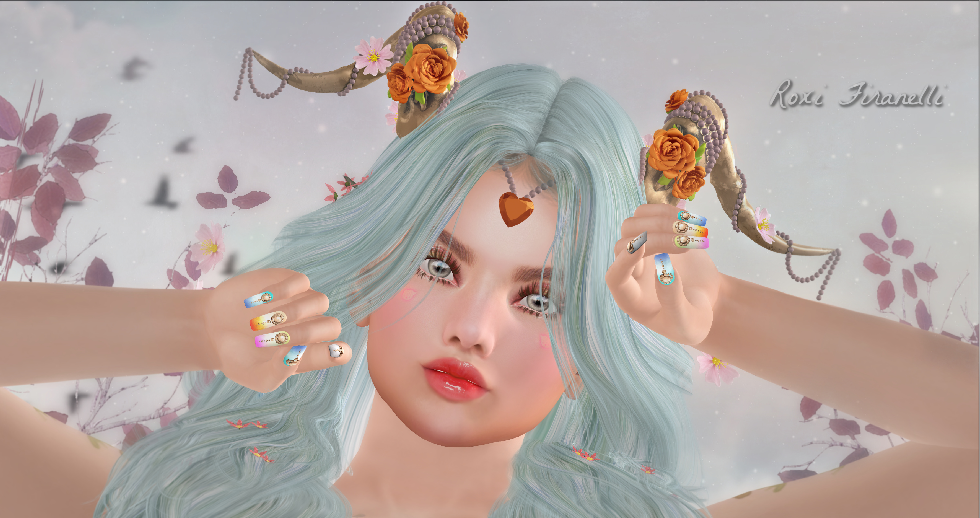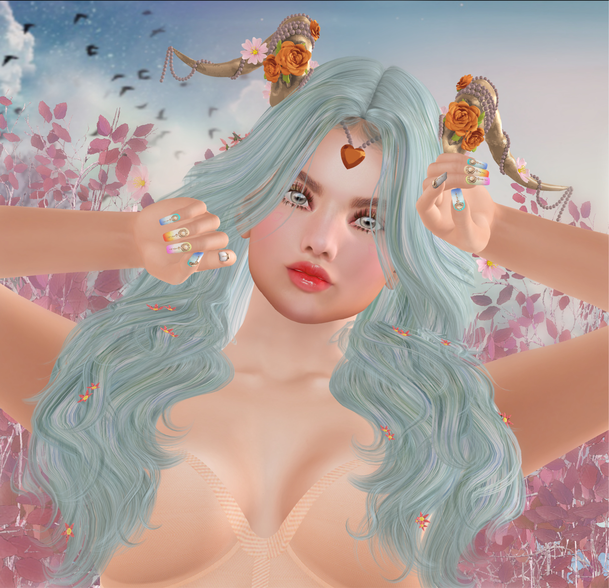 Speaking of hair….gorgeous right!? It’s No.Match and it’s at Bloom right now. There are cute floaty flowers throughout and a HUD that lets you manipulate the colors. The horns are from Apple Blossom and are also at Bloom. They have floaty flowers too…and of course a HUD that gives you a plethora of choices in everything from heart, pearl and flower colors to horn shade. Too cute to pass up! ❤