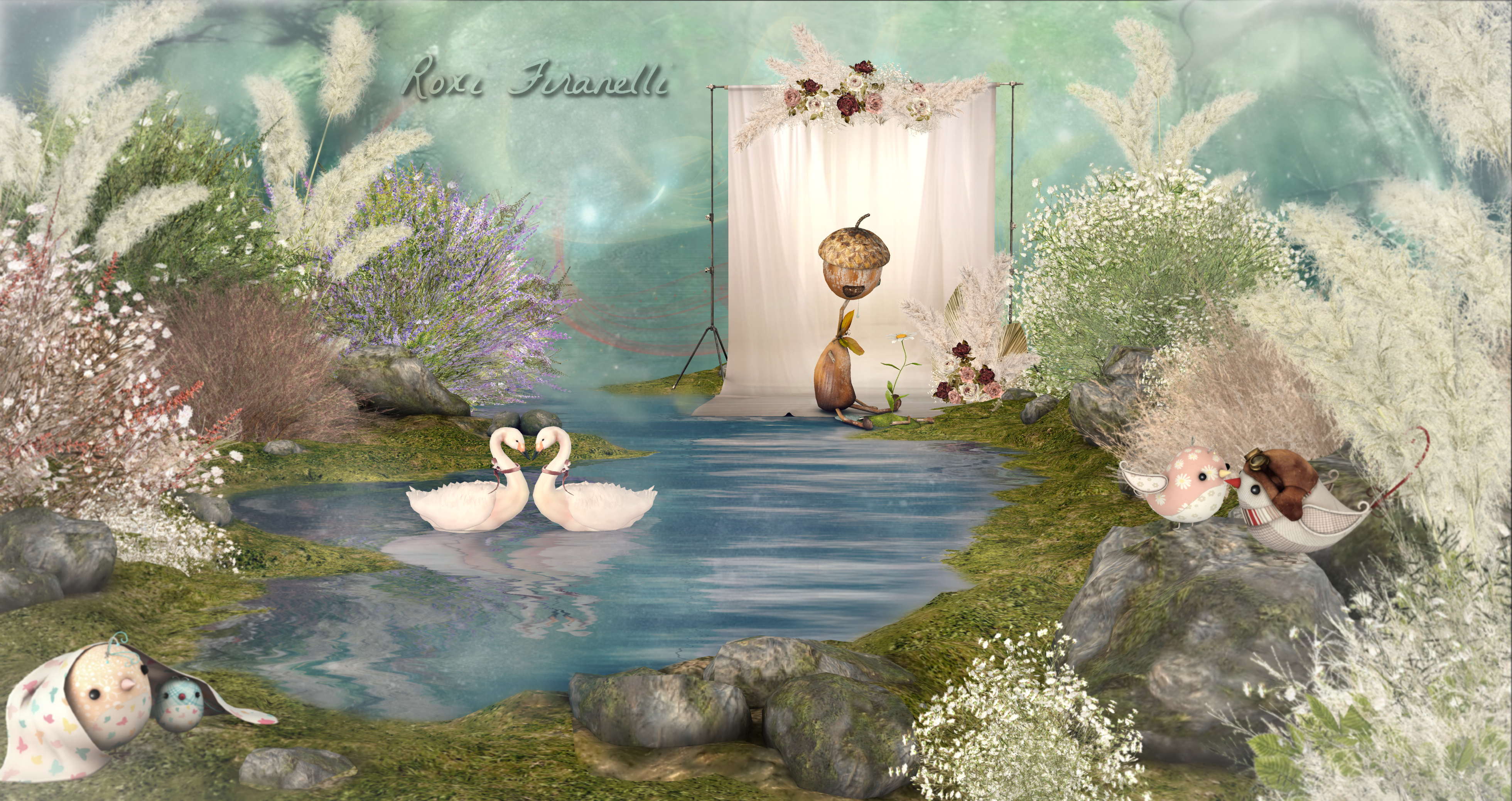 With the exception of the anc swans, everything in this picture is 8f8 (make some fantasy swans iBi!). The Vintage birds and Mr. Broken are from older previous 8f8 sets and are true favorites. All of the landscaping is from the Make Believe collection, including the grass and rocks. Every piece is modifiable…so I made the backdrop smaller to better fit Mr. Broken, as well as the bouquets. All of the plants come with different color options as does the grass/rocks. Magical romantic landscaping at its best. ❤