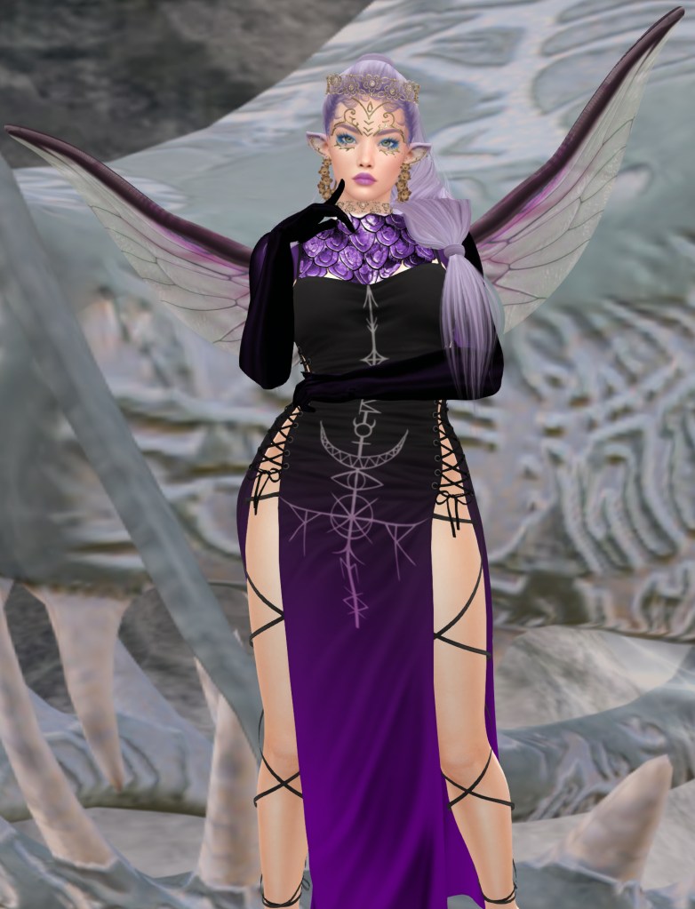The outfit is a mix of goodies from the Faire, from The current round of The Liaison Collaborative and from the weekend sales. Aleutia is the sponsor of Scrimshaw Warrens, so it’s only proper that I wander in her spectacular tribal bindi! Several things about my makeup…..I have 2 layers of eyeshadow on from Poema…the green and the dk. blue….I was trying out the colors and happened upon this combo….it’s subtle that both colors are on, but I really like that! The lipstick from Poema comes in pink and red shades and also has a tintable shade…which I used to my unending happiness to make this violet color. I also have 2 shades on my ear tints from Heaux…I love how the combo looks! My hairbase is the LeL #21 that comes in a folder with the Avalon head and I have tinted it to match the cute hair from KMH. I tinted LeL’s brows too to kinda match…..I love tinting! ❤