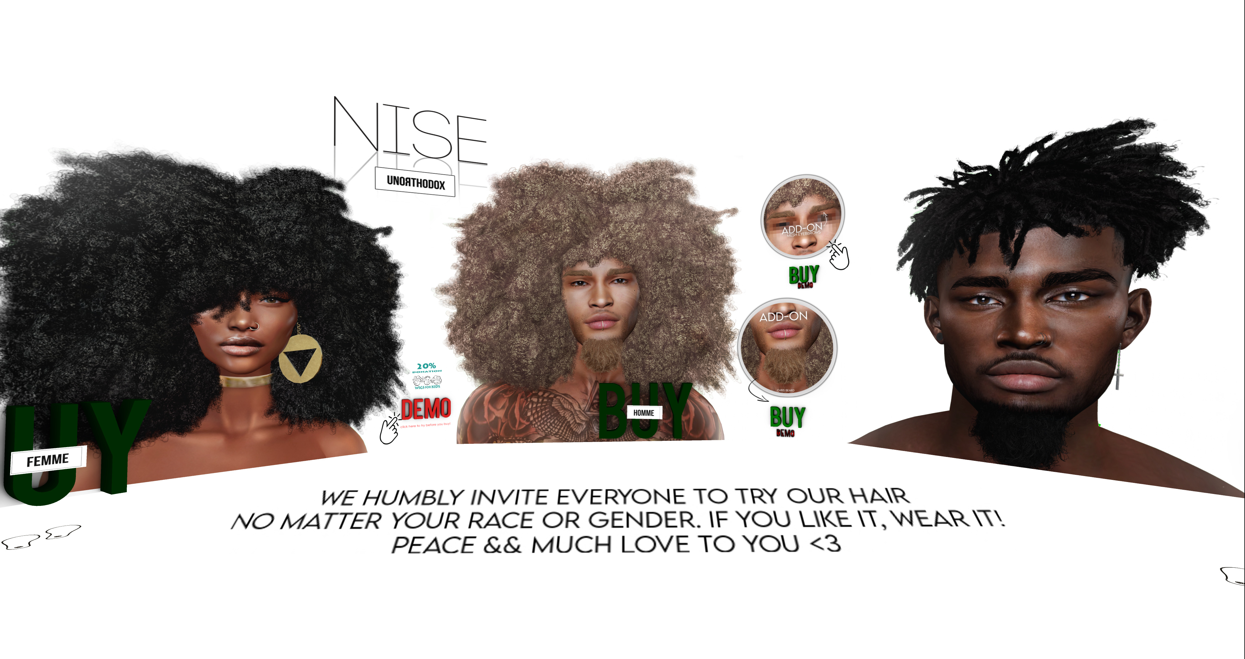 I’m a fan of curls…wild, crazy, unruly curls. I have semi-wild…as do all my offspring…curly red hair down to the last of us, just different shades of red. Isabella has the tightest curls and on a humid day without any product (which is every damn day) her hair is massive. At least, up until last week it was…she talked us into letting her cut it….short….like Ruby Rose faded up but curly on top….sigh…kids just don’t appreciate. Anyway, so when I see those unruly locks in SL I am automatically drawn to them. Unorthodox, Stealthic, Analog Dog…I have them…I love them. The Nise Fro triggered my lust radar instantly when I spotted it at Hair Fair. I had seen somebody’s comment a week or so back (on FB maybe?, I don’t remember), right after the fair opened, saying to the effect that anyone not of color needs to walk right past any ethnic hair. I promise you I’m being much nicer than the commenter, but I honestly don’t remember their wording, just the intention. It pisses me off that I actually hesitated a second or two (we’re not kidding anybody, I’d have bought the hair no matter), then I saw the sign that Unorthodox had in their booth and my admiration for them just rose 50 notches higher that it had been. Love is love peeps…buy the damn hair. ❤