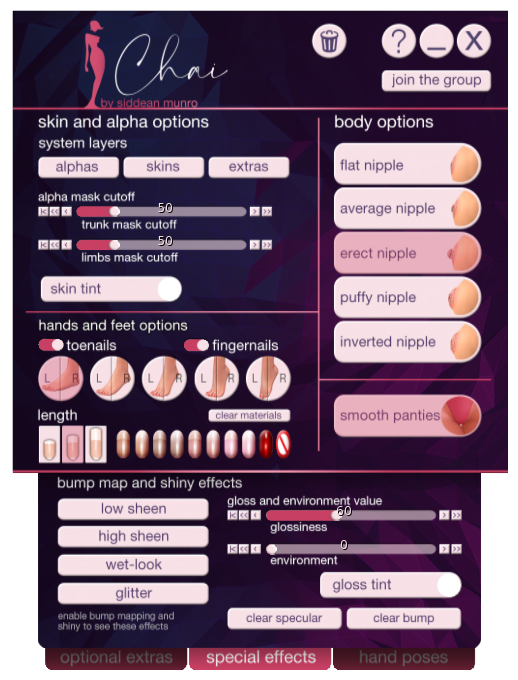 Preview #2 for Skin Fair 2022 is the newest body from Siddean Munro called Chai. She’s hippy (as in hips), big boobed, all around curvy and sports a belly. I put the Caucasian shape on that comes with the package and toned it down a bit to suit my taste…but you can definitely tone it up also if you like…or try one of the other shapes in the package (black and Asian) and play with them. Siddean actually has 2 new bodies out, the other is called Cinnamon. (Cinnamon & Chai is not a SLink product, but the creator is Siddean Munro…the creator and originator of both brands. So there are some crossover items that are compatible with both, such as nails appliers and materials appliers.)