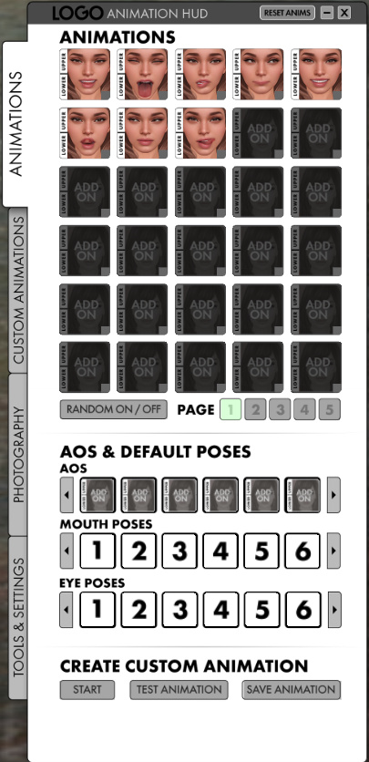 So, the HUD…super user friendly and fun to play with. There is a customization HUD for skin tones, makeup, eye color…etc, etc, and then there’s the animation HUD. See on the Static Expressions where you can choose a top and bottom part of your expression…too much fun and soooo helpful!! I’m looking forward to some free time where I can sit and figure out how to create a custom facial animation using the animations tab! ❤