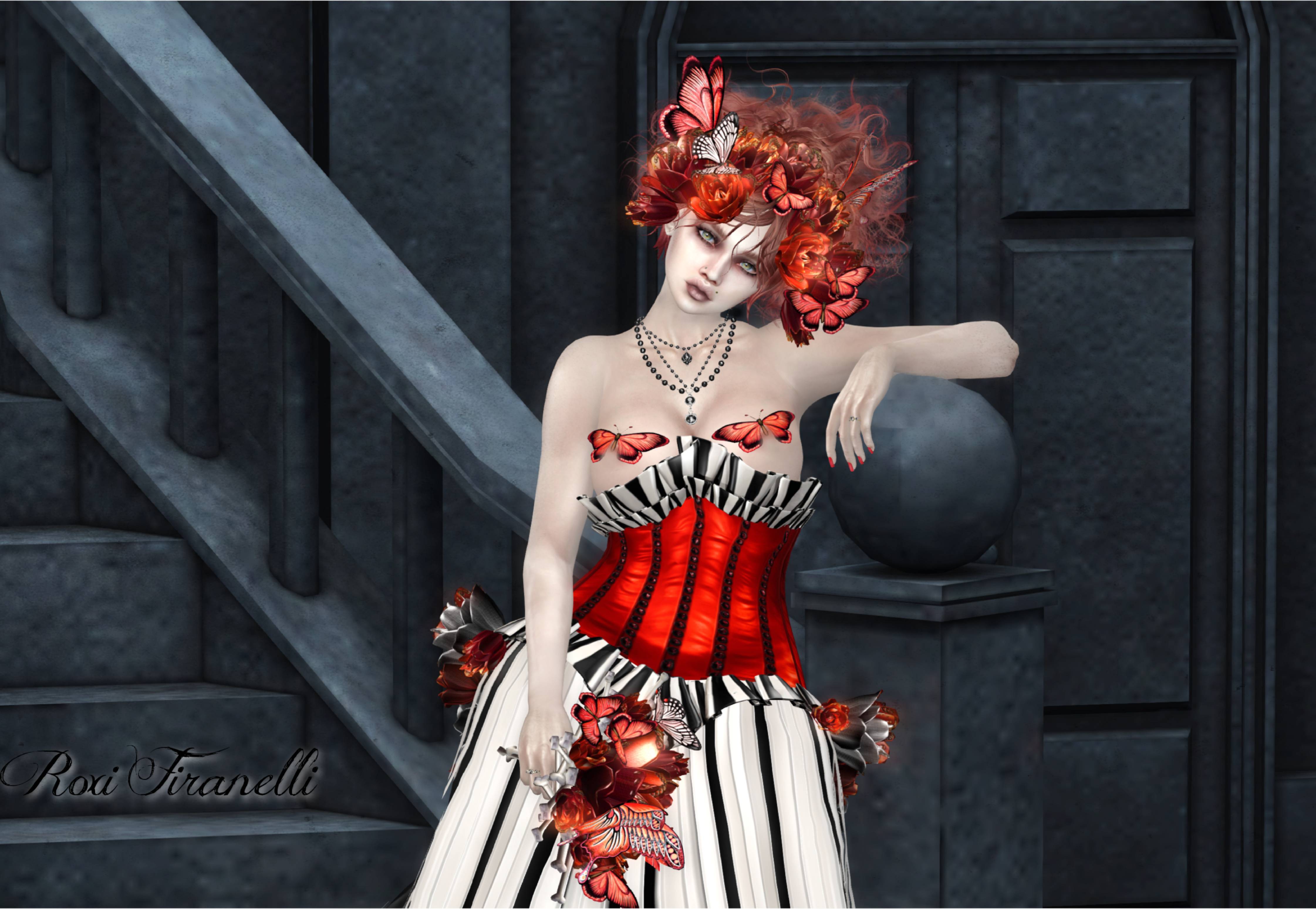 !dM Emilie (Maitreya)- Ruffle Corset, dress, pasties, crown and bouquet @ Enchantment’s Burton-esque