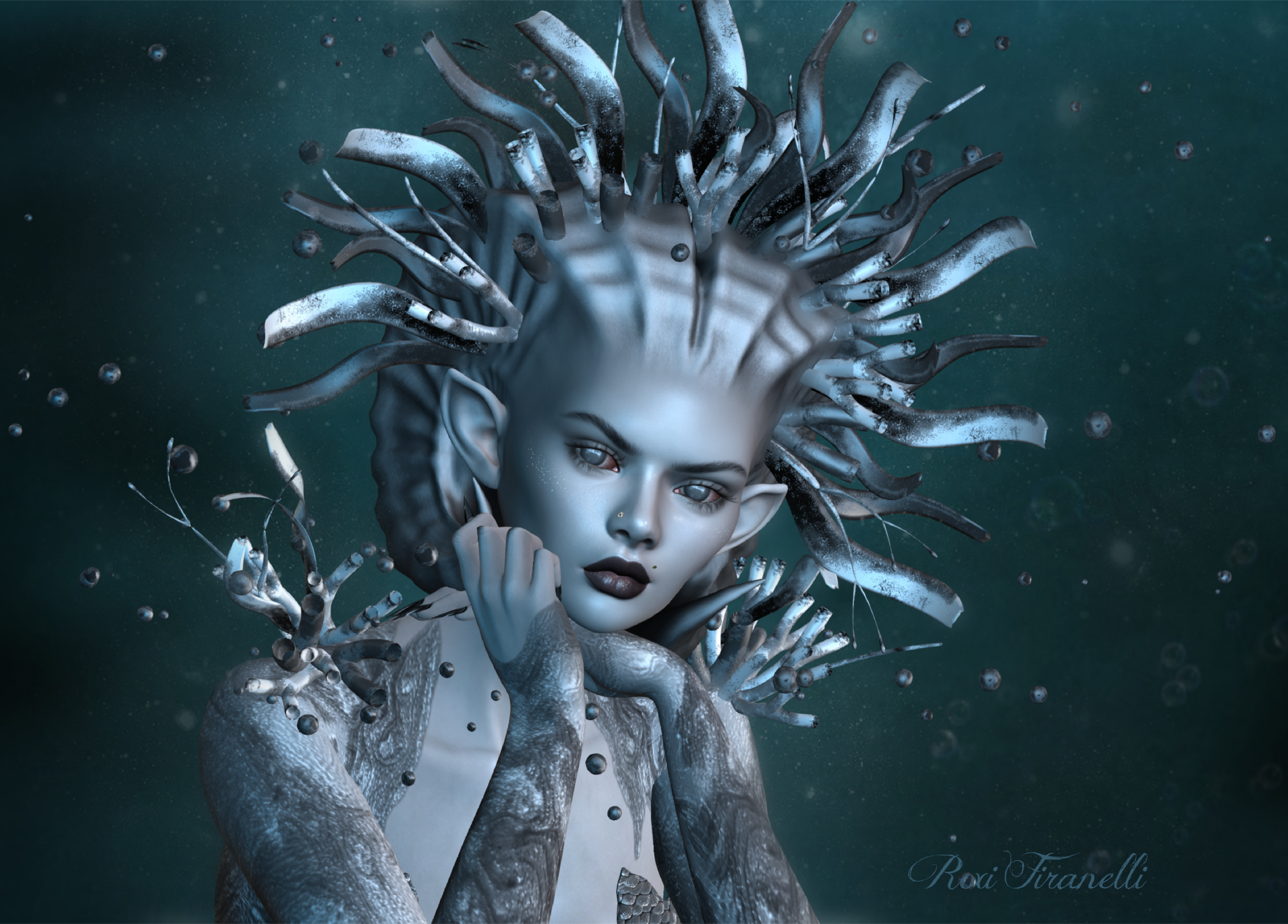 I have some things going on here…mix and match..so let me explain. My head is LeLUTKA’s Lilith, with the horns worn. The skin on the head is Glam Affair’s Lilith in Dracula tone, but the skin on the horns is Velour’s Minerva, their version for the Lilith head….and it’s in a tone called Metallic. It’s a special edition tone that comes in the folder when you buy a Minerva fantasy tone (I bought the Dark Elf tone and was going to use that on the horn till I tried the Metallic). It was a total surprise to me and quite the bonus. The tone blends perfectly from the gray of Glam’s Dracula and fades into black. The black and white anemone growing out of the horns and shoulders are from Zibska and just look so cool in those tones. ❤