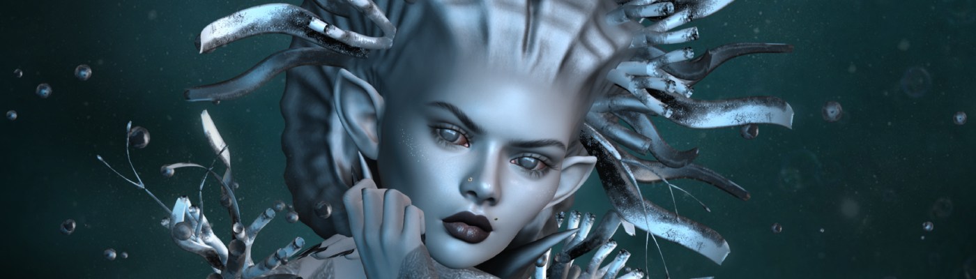 I have some things going on here…mix and match..so let me explain. My head is LeLUTKA’s Lilith, with the horns worn. The skin on the head is Glam Affair’s Lilith in Dracula tone, but the skin on the horns is Velour’s Minerva, their version for the Lilith head….and it’s in a tone called Metallic. It’s a special edition tone that comes in the folder when you buy a Minerva fantasy tone (I bought the Dark Elf tone and was going to use that on the horn till I tried the Metallic). It was a total surprise to me and quite the bonus. The tone blends perfectly from the gray of Glam’s Dracula and fades into black. The black and white anemone growing out of the horns and shoulders are from Zibska and just look so cool in those tones. ❤