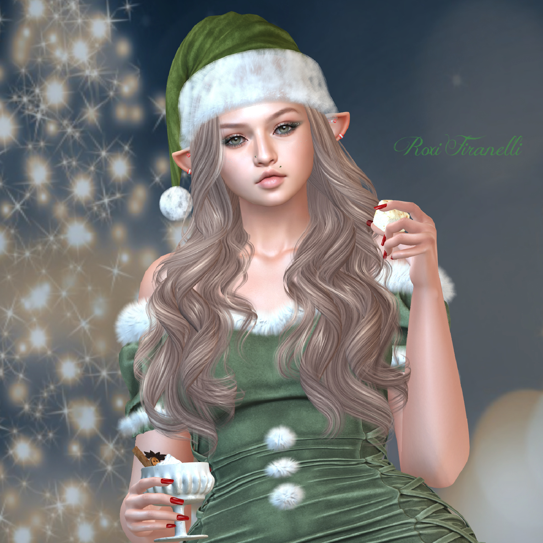 I’m starting the 1st day with the base…LeLUTKA’s free gift, Noel. There is also a guy head, Kris (and lots of guy skins this year!). Noel comes with all the bells and whistles we’re used to, including 4 (rather light-ish) skin tones….blush, porcelain, rose kiss and snow…the rose kiss I have on is the darkest shade…so if you want to go with a snow elf…this is your chance! I have not edited the skin nor default shape…the only thing I did was put on the eyeshadow from WarPaint, eyes from Insol, and the glitter and piercings from the LeL package. Noel is just what you see…a fresh elfish look (you don’t have to wear the elf ears, but they look so perfect with this face!). There are 2 LeL holiday sims to grab the heads, don’t go to the main store! ❤